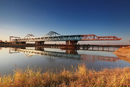 作为京沪高铁重点、难点控制性工程之一,跨河主桥采用五跨连续钢桁柔性拱,有6个主桥墩,在高速铁路同类型桥型中首开纪录。