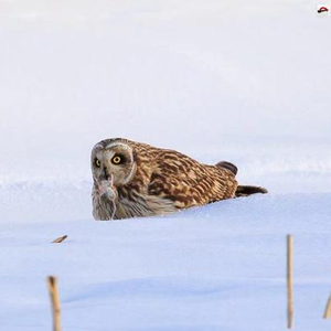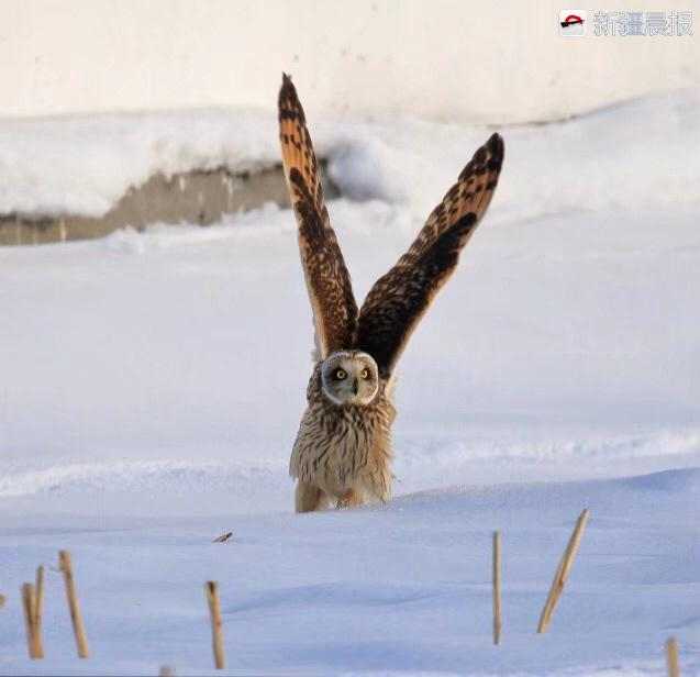 据刘忠德介绍,2月9日上午,他在玛纳斯周边拍鸟时,在一片积雪厚达几十厘米的农田边发现了一只短耳鸮,“个头和一只小的家鸡差不多,大圆脸大眼睛,头背深棕腹部灰白,背部分布着白色斑块,双腿覆盖了一层厚厚的羽毛,像穿了一双雪地靴。”它站在农田边的水泥柱子上,不时侧耳听着雪地的动静,伺机猎捕食物。大约过了十几分钟,这只短耳鸮突然腾空而起,以最快的速度飞向雪地,箭一般地将双爪插进雪里,叼出一只挣扎尖叫的肥鼠。