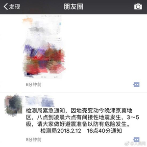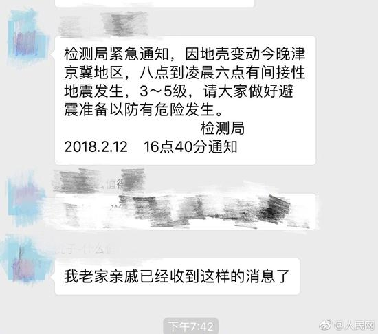 #人民网快讯#[不要再转发这条信息了!是谣言!]12日18时廊坊发生4.4级地震后,朋友圈出现一条消息:“检测局紧急通知,因地壳变动今晚津京冀地区,八点到凌晨六点有间接性地震发生,3~5级,请大家做好避震准备以防有危险发生。检测局2018.2.12 16点40分通知”@震长 提醒:地震系统没有检测局这个单位,目前信息显示这次地震可能为孤立型,原震区发生更大地震可能性不大。转发给更多人!
