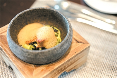 | 波士顿龙虾及泡沫配蚕豆。广州日报全媒体记者曾繁莹 摄 |