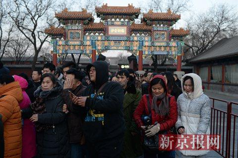 早晨7时许,雍和宫门外等候人群逐渐增多。早在4时便已抵达现场的数名交警、民警、武警以及安保人员组成人墙,维护秩序,将等候的人群沿雍和宫大街人行道向南分成数个150人方队,分批放行,整个队伍已经排到了街尾。约一刻钟后,雍和宫正门打开,6名安保人员手挽手排在最前端,将人流带往安检口,人们鱼贯而入上香祈福。