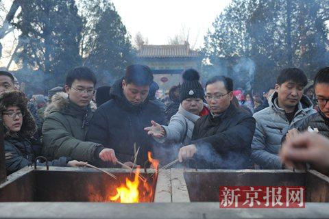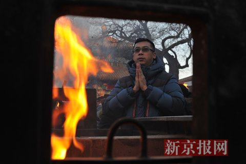 第一批进入的香客烧香祈福。新京报记者 吴江 摄
