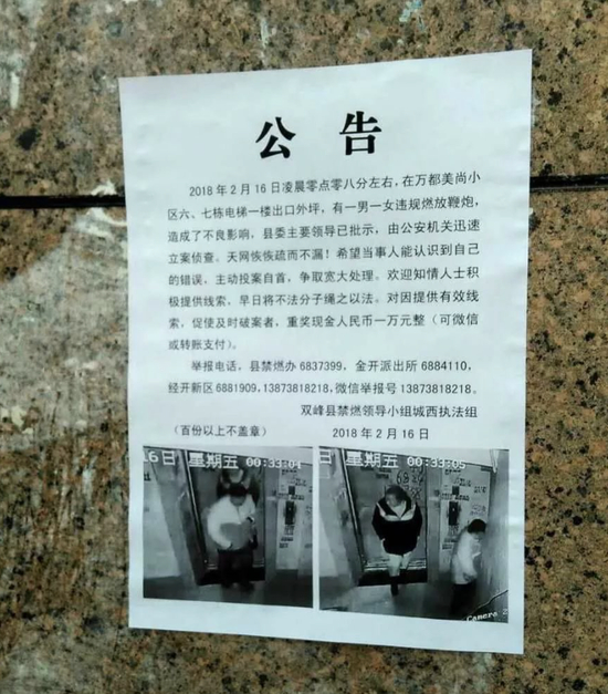 2月16日,也就是农历大年初一,落款为“双峰县禁燃领导小组城西执法组”的一则追捕“公告”引发关注。该公告称,(湖南)双峰县一男一女在2月16日凌晨零点零八分,在小区外坪违规放鞭炮,被县委主要领导批示,当地公安机关设立奖金一万元追捕。