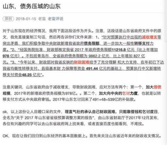 一方面是GDP数字的耀眼,另一方面是对山东经济前景的忧虑。近日,一篇名为《山东,债务压城的山东》的文章,再一次把山东推向了舆论焦点。文章称,作为经济规模全国第三的省份,山东省财政已经入不敷出,开始伸手想中央要钱,甚至称断定山东省可能要破产。