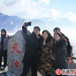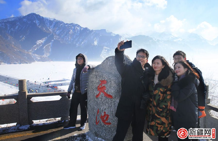 2月20日,天山天池风景区,游客在观景平台自拍留念。春节假期期间,新疆丰富的冰雪资源吸引了不少来自五湖四海的游客,美丽的雪景、趣味性十足的冰上娱乐项目、专业的滑雪场让游客们流连忘返。(记者蒋晓摄)