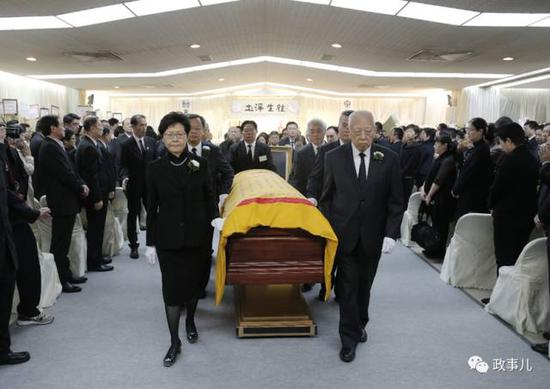 扶灵的包括全国政协副主席董建华、香港特区行政长官林郑月娥、中联办副主任黄兰发和港大饶宗颐学术馆馆长李焯芬等。