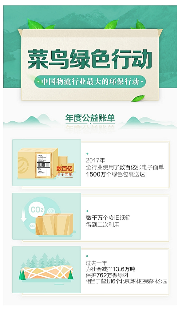 “阿里巴巴董事局主席马云多次号召物流业参与者要关注绿色发展,支持绿色行动。他认为未来的快递业当中,‘快’只能保证不输,‘绿’才能赢。”启动仪式上,菜鸟网络绿色行动负责人牛智敬介绍,在菜鸟网络的带动下,2017年全国快递行业推出了电子面单、绿色包裹、新能源智慧车等环保措施。