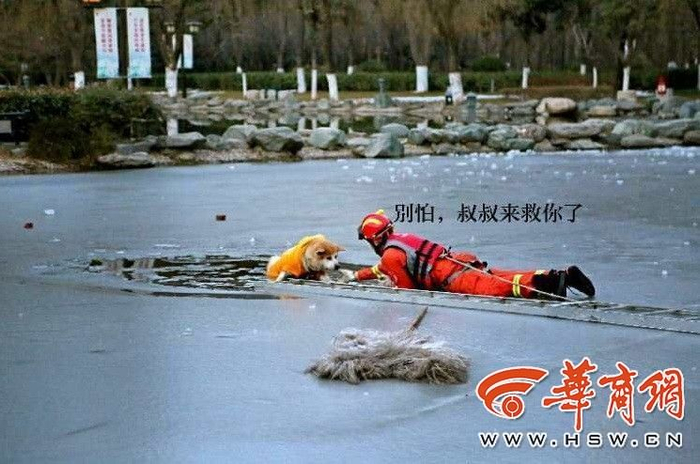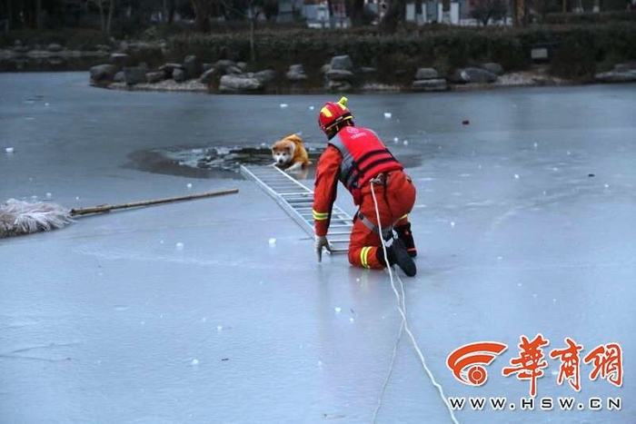 西安女子宠物狗落水 消防官兵爬在冰上救助