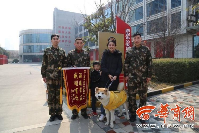 为了表示感谢,哈士奇的主人顾女士来到特勤一中队,为消防官兵赠送锦旗。顾女士说,消防官兵不怕危险,出警救助落入湖中的宠物狗,即使落入冰湖中也时刻不忘记自己的任务, 她向消防官兵表达敬意和感谢。