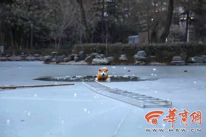 近日,在西安市木塔寺公园一只哈士奇宠物狗在冰面上玩耍时落入水中,一时无法出来。西安消防支队特勤一中队接到119指挥中心调度命令后,7名战斗员乘一部抢险救援车火速前往现场。