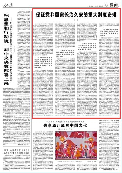 我国宪法是治国理政的总章程,必须体现党和人民事业的历史进步,必须随着党领导人民建设中国特色社会主义实践的发展而不断完善发展。党的十九届二中全会审议通过的《中共中央关于修改宪法部分内容的建议》(以下简称《建议》),站在健全完善党和国家领导制度、推进国家治理体系和治理能力现代化的高度,作出了一系列重大制度设计,包括坚持党的领导、人大制度、统一战线制度、宪法宣誓制度、国家主席任期制度、国务院管理制度、地方立法制度、监察制度,等等。这些重大修改建议,是保证党和国家长治久安的顶层设计和制度安排。