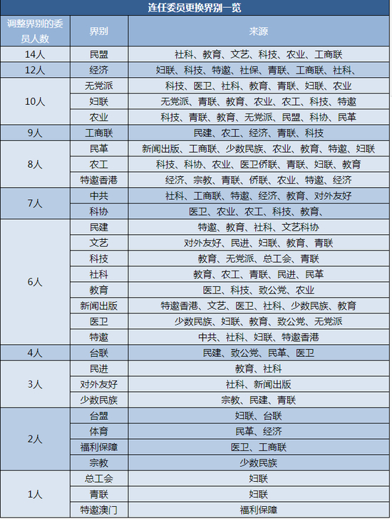 文艺界别人数减幅较大、连任委员数量较少,仅有44人,其中6人还是从其它界别调整而来,等同于文艺界别本身连任委员仅有38人。体育界别连任委员也很少,21人中仅7人连任,同样有界别调整的情况。