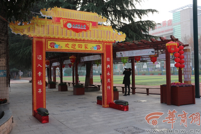 早上8时许,大明宫小学1800余名学生在爸爸妈妈的陪伴下陆续走入校园,发现学校变样了,飞檐、红瓦、灯笼、宫门……焕然一新的校园充满着浓浓中国味。校长强曼丽带领学校行政管理团队伫立在喜庆的“宫门”前迎接同学们回家。