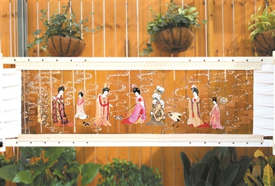 这也就是为什么我们一直说要创新,在作品《缕薇传》,我们不仅尝试了中西合璧的刺绣技法,在材料上还大胆运用了陶瓷,就是作品中女性的脸,我们把陶瓷烧制成脸型,然后缝制在作品上,而五官则是手绘上去的。