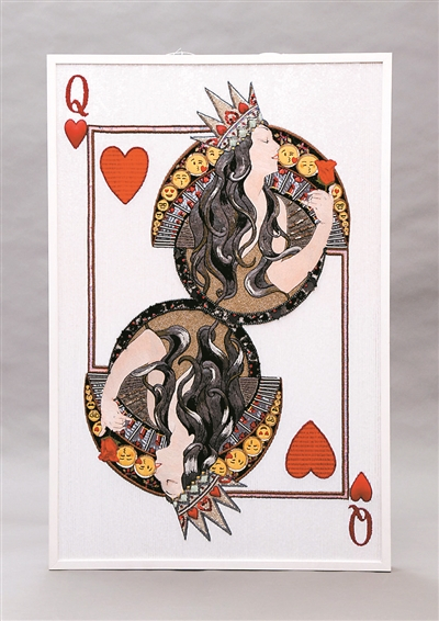 这幅获奖作品为该系列的第三幅作品,“这次是英国这家刺绣坊的250周年庆,所以他们希望参赛作品能够呈现欢悦、庆祝的氛围,趣味性多一点,我们这个系列和这个比赛主题就不谋而合了,而英国又恰好有英女王”,张晓星解释道,而且与一般的单面刺绣作品不同,《The Queen》是双面的,正反两面的图案还不一样,就像是一张扑克牌有正反面,这也让这幅作品可以悬空吊挂360度进行欣赏。