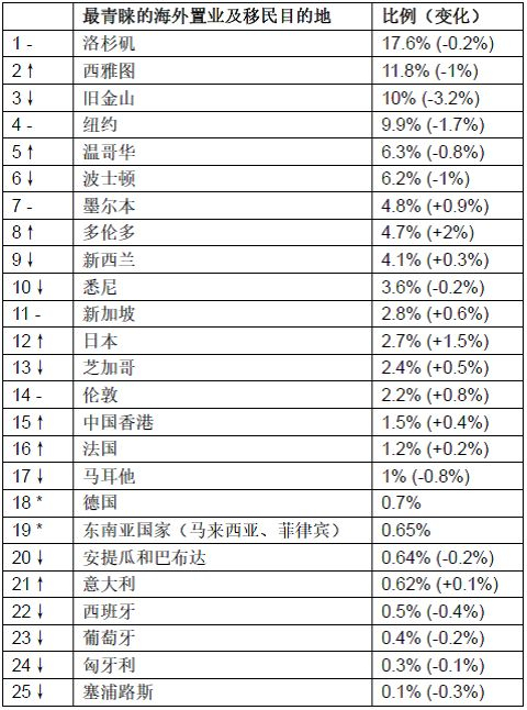 中国高净值人群所青睐的海外置业、移民目的地前十名依次为:洛杉矶、西雅图、旧金山、纽约、温哥华、波士顿、墨尔本、多伦多、新西兰和悉尼。其中,洛杉矶已连续四年成为中国高净值人群最青睐的海外置业和移民城市,西雅图逐年上升,今年首次超越旧金山,到第二位,旧金山退居第三,比例也下降最多。纽约维持第四,温哥华继去年下降一位之后,再次回到第五,波士顿则回落到第六,墨尔本维持去年的第七,多伦多上升两位,再次排到第八。(根据《2017汇加移民•胡润中国投资移民白皮书》)