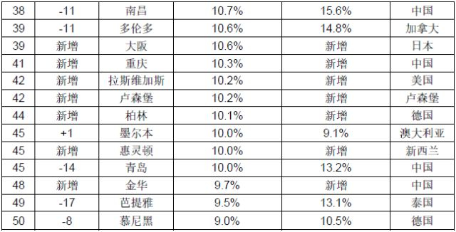 前50名投资回报率最高的城市共来自19个国家,其中美国以11个城市居首,其次是英国7个,德国、澳大利亚和加拿大各有4个,法国、新西兰、西班牙、日本、瑞士和泰国各有2个,中国、爱尔兰、奥地利、卢森堡、阿联酋、韩国、马来西亚和印度尼西亚各有1个。