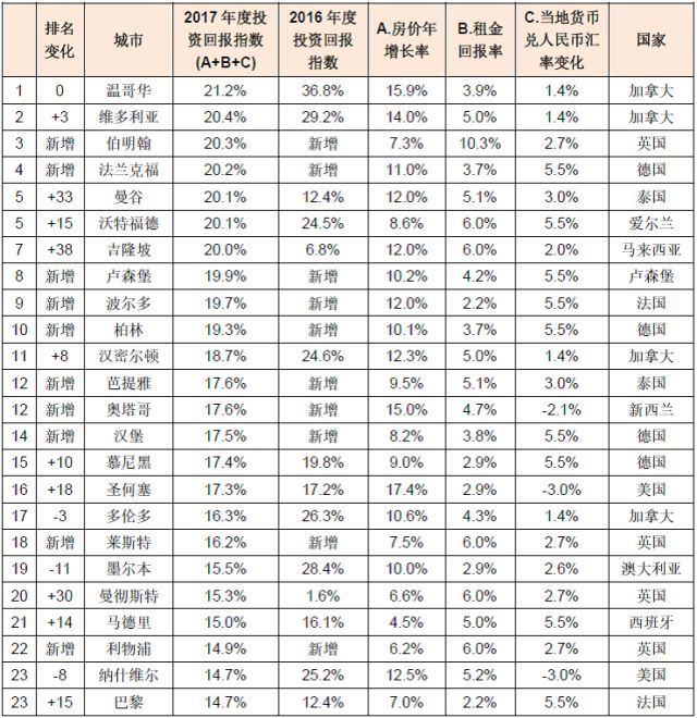 加拿大的温哥华成为全球置业投资回报最高的城市,多伦多在2017年4月向海外买家开征15%的“非居民投机税”、扩大对房屋租金上涨的法规控制、开征房屋空置税等,以抑制大多伦多地区房价的飞速上涨,随着多伦多房地产市场的硝烟慢慢冷却,温哥华的房价却重新恢复了活力。排名第二是维多利亚。英国的伯明翰以其可观的租金收益率成为全球置业投资回报第三高的城市。