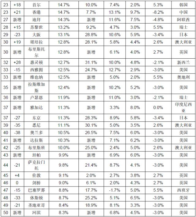 最近一年全球房价涨幅最高的前50名城市中,有47个涨幅在10%以上,第50名涨幅9%。海外置业投资回报率最高的前50名城市中,有7个在20%以上,第50名回报率8.3%。
