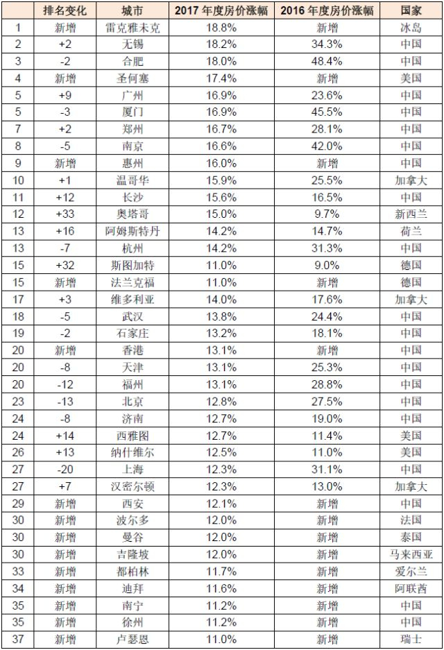 总体来看,2017年度全球房价涨幅较去年放缓。冰岛首都雷克雅未克跃居全球房价涨幅第一,涨幅达18.8%。无锡依旧为大陆房价涨幅最快的城市,前十名中国占7位,美国圣何塞位居第四位,温哥华位居第十位。