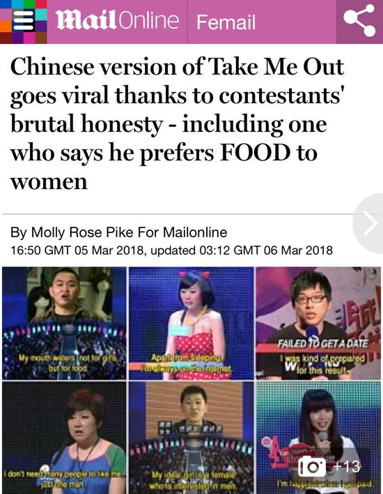 报道称,把这些截图搬到推特上的,是一位名叫Bobby Sun的来自伦敦的用户,他在特的推文里写道:中国的这档相亲综艺节目“极其地贴近生活”。