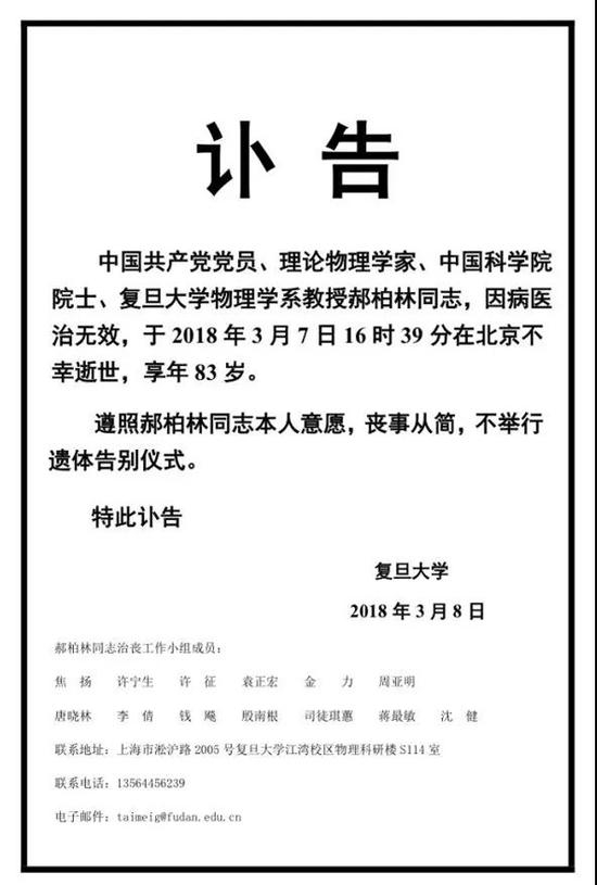 中国共产党党员,中国科学院院士,著名理论物理学家,我国统计物理、计算物理、非线性科学和生物信息学的身体力行的推动者,复旦大学理论生命科学研究中心主任、物理学系教授、博士生导师郝柏林先生因病医治无效,于3月7日16时39分在北京逝世,享年83岁。