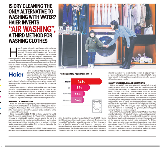 美国当地时间3月10日,《华尔街日报》刊登一篇题为《不是水洗就是干洗?海尔发明“空气洗”开创第三种洗涤方式》的新闻,文章内容如下: