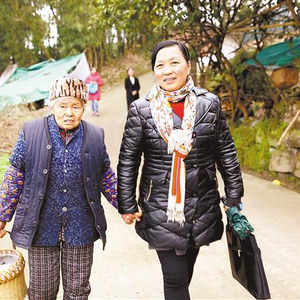 黄明琼(右)拉着八十三岁高龄的老党员兰定珍的手边走边聊,了解乡风文明建设情况。特约摄影 刘辉