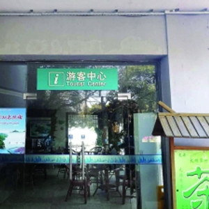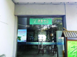 经过几级楼梯来到游客中心近前,两扇玻璃门用铁链加明锁锁着,门外没有游客中心营业时间、服务内容的标识,只是透过玻璃窗看见有雨伞、书报展架等。游客中心对面便是三山岛游客乘船处,此时,从游船上下来的游客以及等待最后一班游船的游客往来穿梭。“游客中心一般几点关门?”记者询问有一位正好经过、穿工作服的园区工作人员。“一般这边下午四点半之前吧,景区6点以后也停止售票。因为最后一班游船是下午4:50开航,我们差不多晚上6点钟下班。”工作人员回答。“万一游客有问题要咨询或者需要租用轮椅等一些服务呢?”记者继续询问。“一般都不会吧,万一有重要的事我们再打电话汇报情况,会有相关人员过来处理的。”工作人员如是回答。