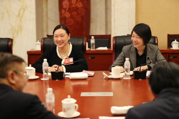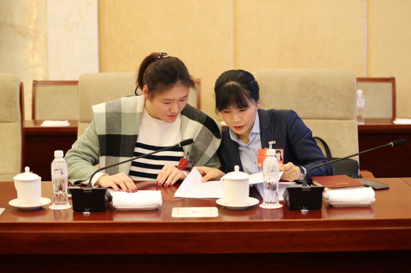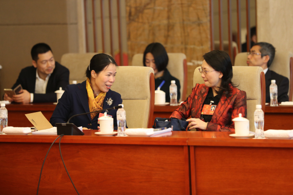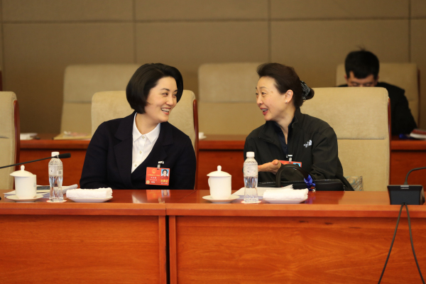 全国人大代表周慧(左)、全国人大代表罗卫红交流。记者张哲 摄