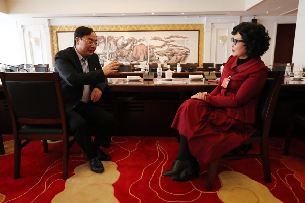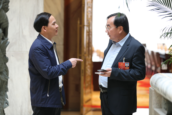 全国人大代表尹学群(左)、全国人大代表贾宇交流。记者张哲 摄