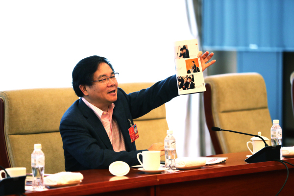全国人大代表丁列明向代表们展示两会期间杂志刊登的资讯。记者张哲 摄