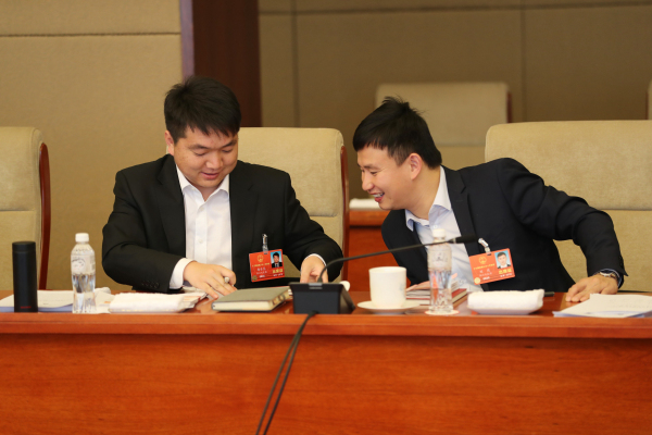 全国人大代表杨金龙(左)、全国人大代表刘廷热议监察法草案。记者张哲 摄