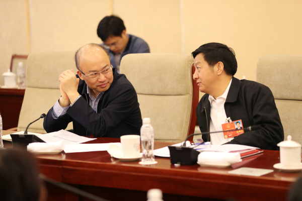 全国人大代表徐文光(右)在会上发言,全国人大代表方剑乔听取发言。记者张哲 摄