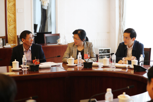 全国人大代表夏永祥(左)、全国人大代表张咏梅(中)、全国人大代表张世方热议监察法草案。记者张哲 摄