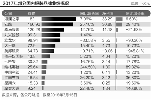 截至3月15日,根据国内多家沪深、港股上市公司发布的财报业绩,本土服装企业2017年的表现整体向好。安踏、森马、太平鸟、七匹狼、江南布衣等品牌营收增速达到了两位数,“但总体来说全面回暖为时尚早”。