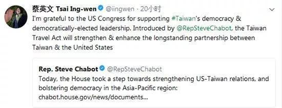 今年1月,众议院刚通过此法案的时候,蔡英文就发推叩谢,感谢美国众议院支持台湾当局所谓的“民主”,还叫嚣此举将有助于强化“美台”之间“持续性的伙伴关系”。