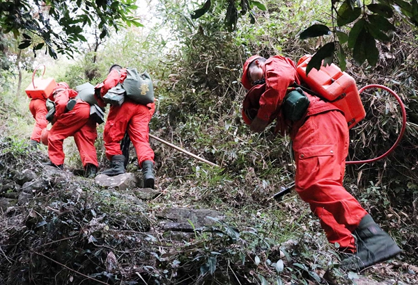 根据现场勘查和火场态势情况,大队教导员蒲嘉郡决心采取“避强击弱、一线平推”的战法,由火场南侧山脚一线打开突破口,运用灭火弹、风力灭火机、高压细水雾等工具实施灭火。