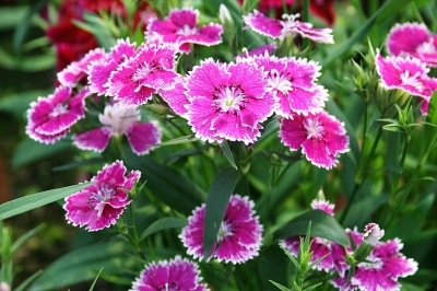 石竹:盛开时小花如油纸伞,花朵边缘有齿裂。石竹品种丰富,花色有粉、红等。