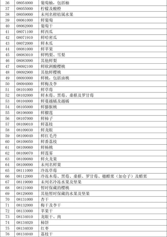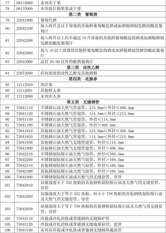 第一部分共计120个税项,涉及美对华9.77亿美元出口,包括鲜水果、干果及坚果制品、葡萄酒、改性乙醇、花旗参、无缝钢管等产品,拟加征15%的关税。