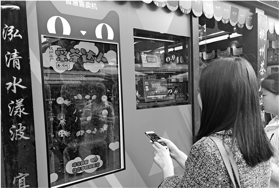 | 两位市民正在天猫智慧售卖机上玩“采茶” |