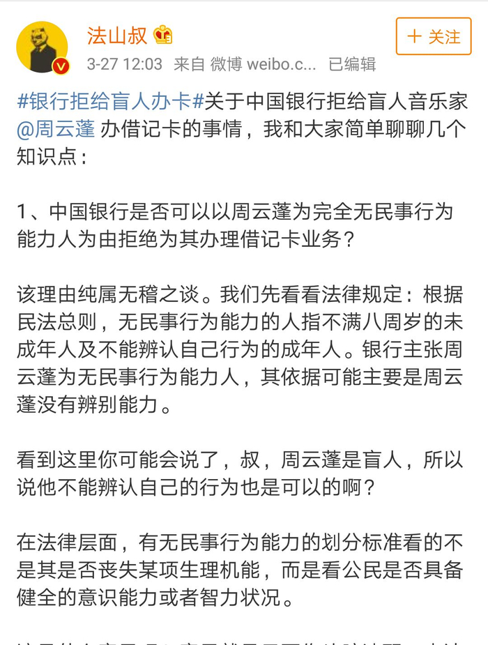 比如法律博主@法山叔 就表示中国银行以周云蓬为完全无民事行为能力人为由拒绝为他办理借记卡是“无稽之谈”,因为“在法律层面,有无民事行为能力的划分标准看的不是其是否丧失某项生理机能,而是看公民是否具备健全的意识能力或者智力状况。”