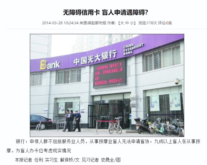 而耿直哥觉得最奇葩的,是2014光大银行惹出了一起事件。这家银行于2007年推出了一种据其宣传为了方便盲人使用的“无障碍信用卡”。可申请这个银行卡的盲人们却很快发现,光大银行给这个为了方便他们使用的信用卡加了一个很古怪的条款:从事服务业的盲人不的申请。