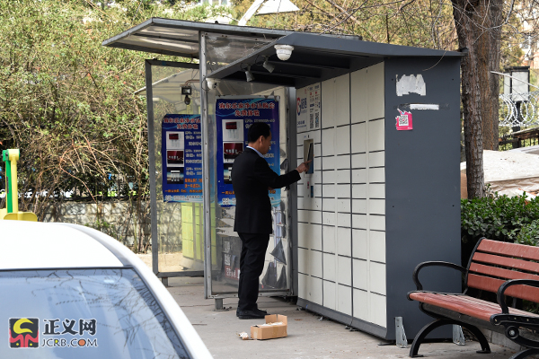 一名职工正在快递柜前收取快递。该快递柜附近道路较窄,不具备停车条件,所以该快递柜的利用率较高。钟心宇 摄