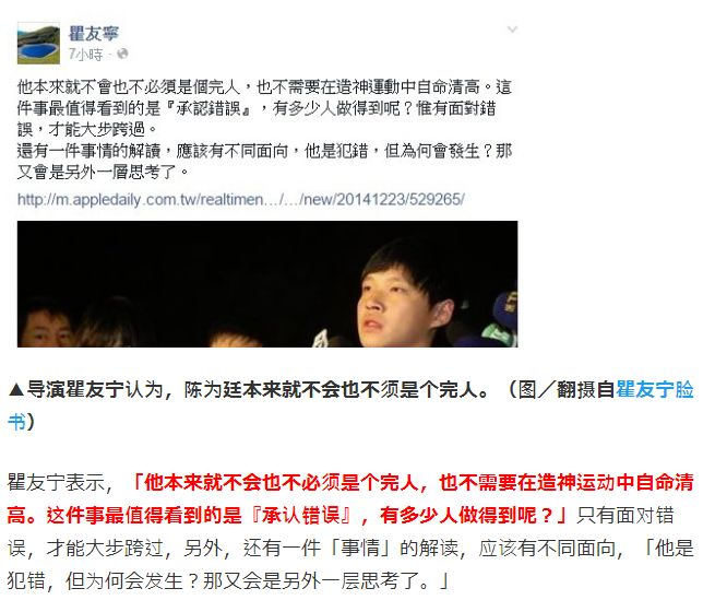 台湾“东森新闻网”2014年12月24日报道称,“太阳花学运”头目陈为廷自爆曾在公车上对女乘客袭胸,就在岛内网友痛骂陈“人面兽心”“行为下流”时,瞿友宁却站出来声援,称“他本来就不会也不必须是个完人”。