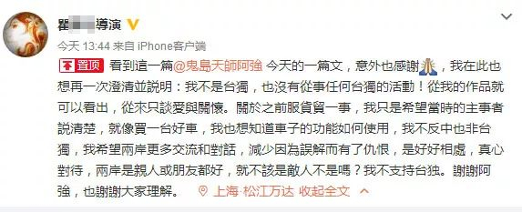 新剧即将在大陆上映 导演急了忙撇清:我不是台独