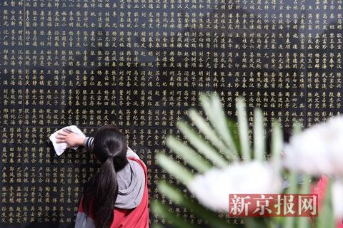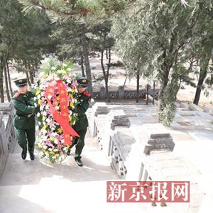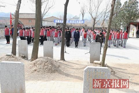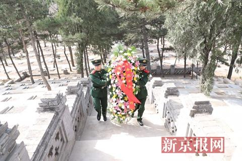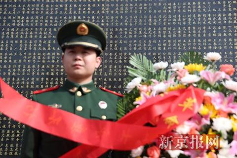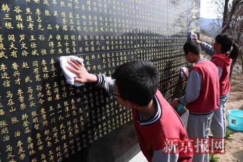 3月30日清晨,长城脚下的八达岭烈士陵园内,八达岭镇中小学生胸前佩戴小白花,站在延庆区烈士纪念墙前,向延庆籍和在延庆牺牲的2165名烈士敬献花篮。