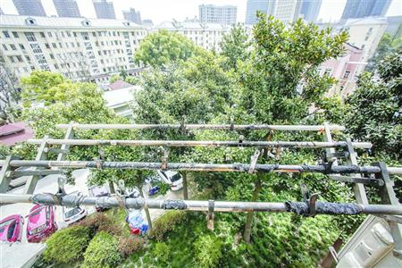 张先生的窗户外面,防盗窗向外延伸,用不锈钢焊接成镂空的铁栅栏。在防盗窗顶部,还有铁皮隔层。“除了遮雨外,还因为楼上时常有人丢烟蒂,我们用铁皮隔着,起到保护作用。”在窗台外的防盗窗架子上,张先生还铺了一层薄木板,以防东西掉到楼下去。
