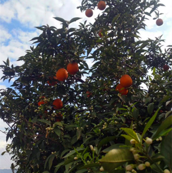 春橙树上现奇观:一边开花一边结果