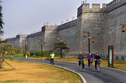 图:市民、游客骑行在城墙下。